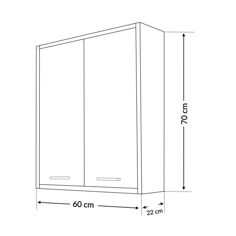 A fürdőszoba szekrény kevés helyet foglal viszont rendelkezik egy két ajtós szekrénnyel ahol két polc található így kényelmesen elférnek a fürdőszobai pipere eszközök. Kevés helyigénye miatt kisebb fürdőszobák berendezésére is alkalmas, például panel lakásokban. A termék magas minőségű bútorlapból készül és színben passzoló élzárókkal van ellátva. A fürdőszoba bútor felfüggesztett kivitelben kapható.