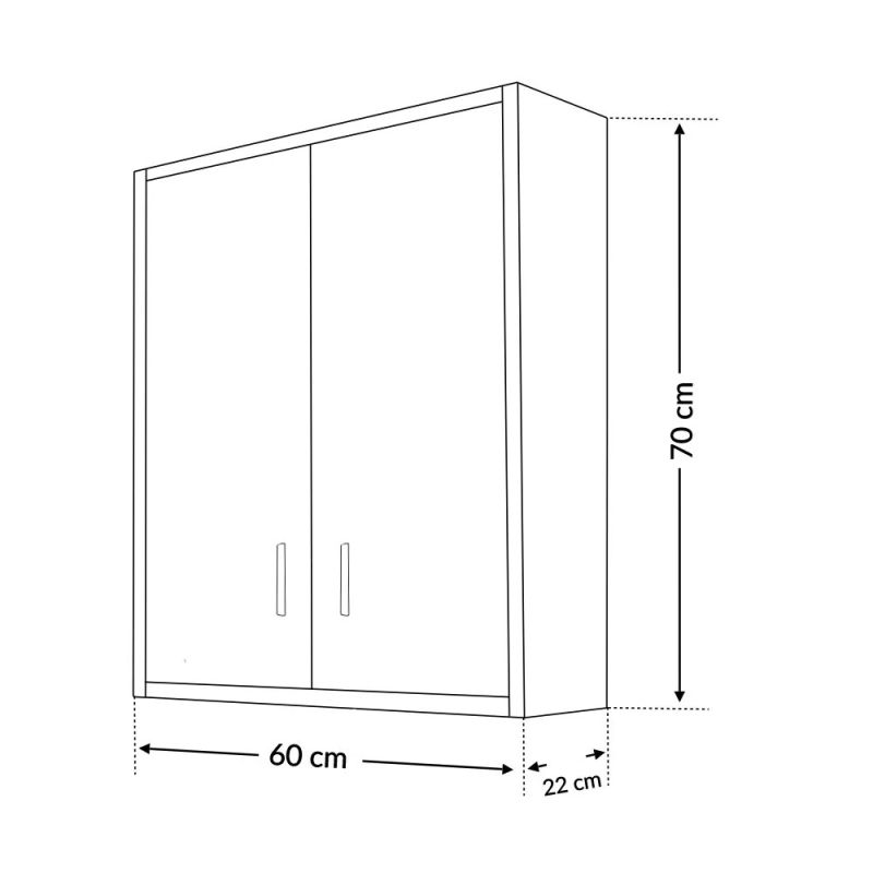 A fürdőszoba szekrény kevés helyet foglal viszont rendelkezik egy két ajtós szekrénnyel ahol két polc található így kényelmesen elférnek a fürdőszobai pipere eszközök. Kevés helyigénye miatt kisebb fürdőszobák berendezésére is alkalmas, például panel lakásokban. A termék magas minőségű bútorlapból készül és színben passzoló élzárókkal van ellátva. A fürdőszoba bútor felfüggesztett kivitelben kapható.