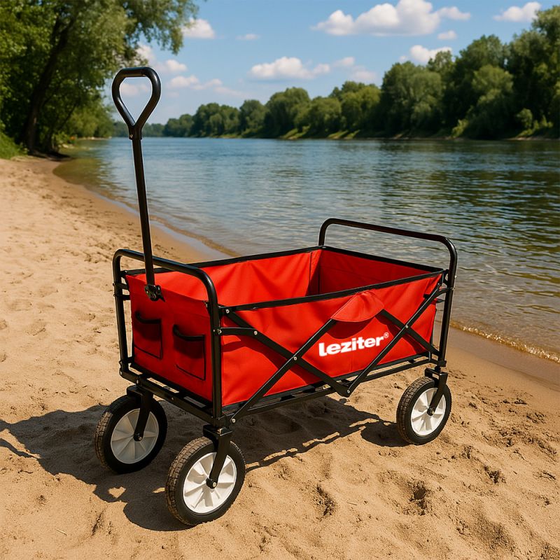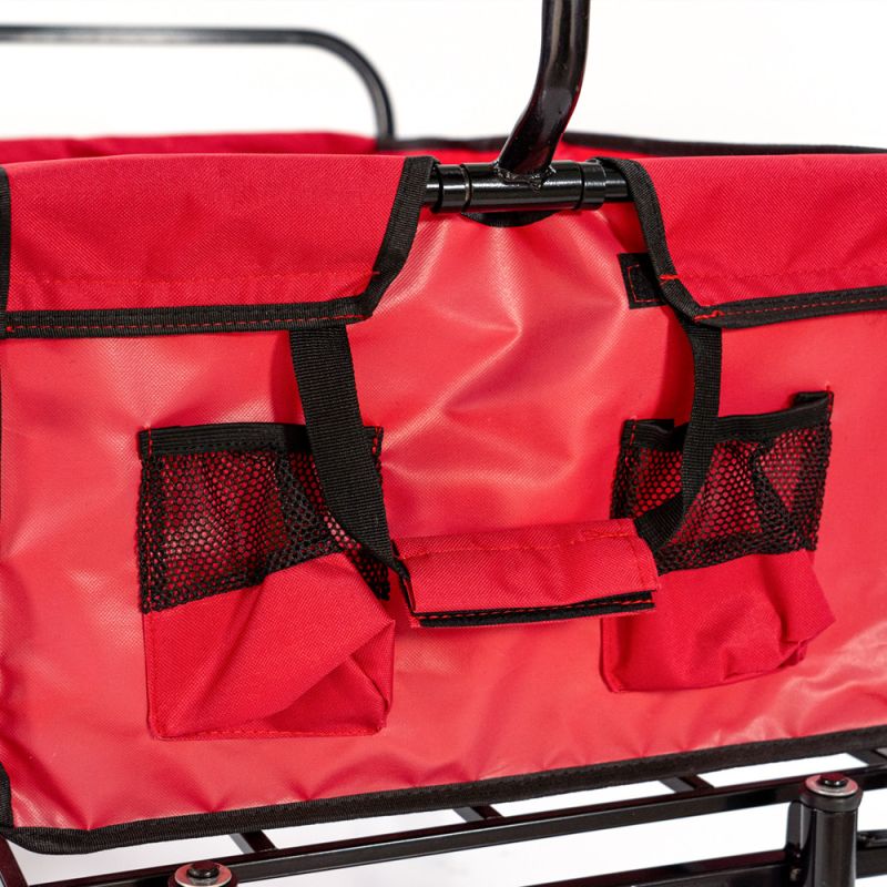 Anyag: A strandkocsi acél vázzal rendelkezik, ami rendkívül stabil és tartós. A kosara 600D poliészter szövetből készült, ami nemcsak erős és strapabíró, hanem könnyen tisztítható is. A élénk piros szín pedig figyelemfelkeltő megjelenést kölcsönöz a kocsinak.