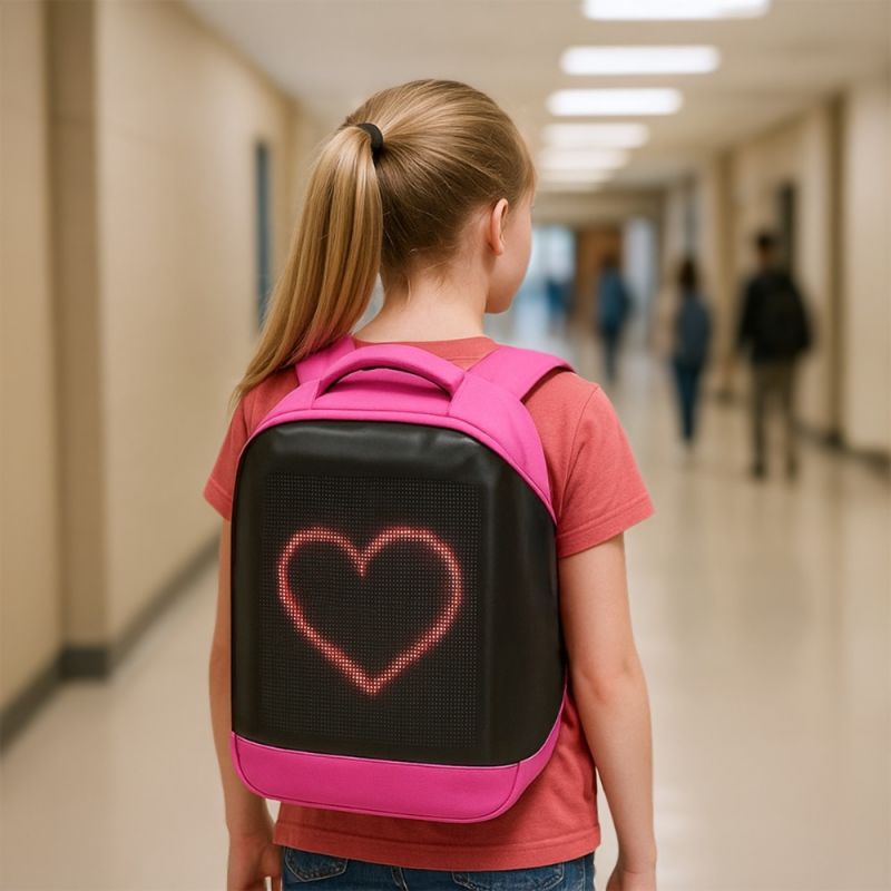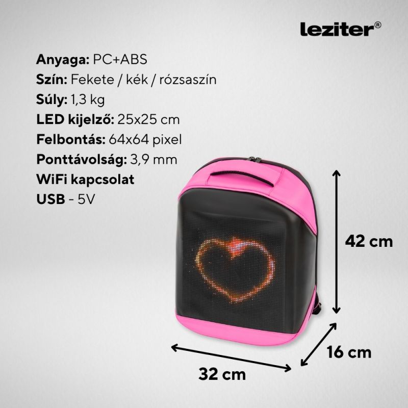 Pixa ledes okos hátizsák – rózsaszín szín Legyen a Tiéd a Leziter Pixa LED okos hátizsák, és mutasd meg a világnak a stílusod, a kreativitásod és az egyéniséged minden lépéseddel – mert mostantól te írod a saját fényüzeneteidet! A Leziter Pixa WiFi vezérelt LED-es okos hátizsák lehetővé teszi, hogy az aktuális hangulatodat, kedvenc mintáidat vagy akár személyes üzeneteidet is megjelenítsd a hátizsákodon. A 25 × 25 cm-es LED kijelző 64 × 64 pixeles felbontással és 3,9 mm-es ponttávolsággal biztosítja a tiszta, élénk megjelenítést. Power bankról működtethető (USB 5V), így akár útközben is használhatod. WiFi-kapcsolat és RHX Plus applikáció A kijelzőt WiFi kapcsolattal vezérelheted, az RHX Plus nevű applikáción keresztül, amely elérhető Androidra és iOS-re is. A csatlakozás egyszerű: a táska saját WiFi-hálózatához kell kapcsolódni, majd saját grafikát, szöveget, animációt vagy akár pixelartot is feltölthetsz a kijelzőre néhány kattintással. A QR-kód az útmutatóban található, amely megkönnyíti a letöltést. Power bankkal működik, így bárhol feltöltheted A hátizsák beépített USB töltőporttal rendelkezik, így könnyedén csatlakoztathatod hozzá a saját power bankodat (nem tartozék). Ezáltal a kijelző működéséhez szükséges tápellátást bárhol biztosítani tudod, miközben akár a telefonodat is töltheted menet közben. Tartós, praktikus, kényelmes – minden részletében átgondolt - Strapabíró anyaghasználat – PC + ABS borítás, amely vízlepergető, ütésálló és könnyen tisztítható