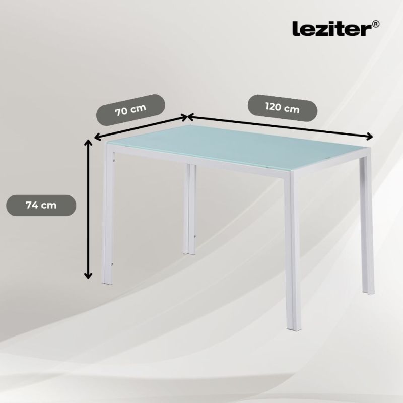 Az üvegfelület elegáns hatást kelt és könnyen tisztítható. A fehér fém lábak stabilitást adnak az asztalnak, és világosabbá, letisztultabbá teszik a teret. Méretének köszönhetően kisebb és nagyobb étkezőkben is jól elfér.