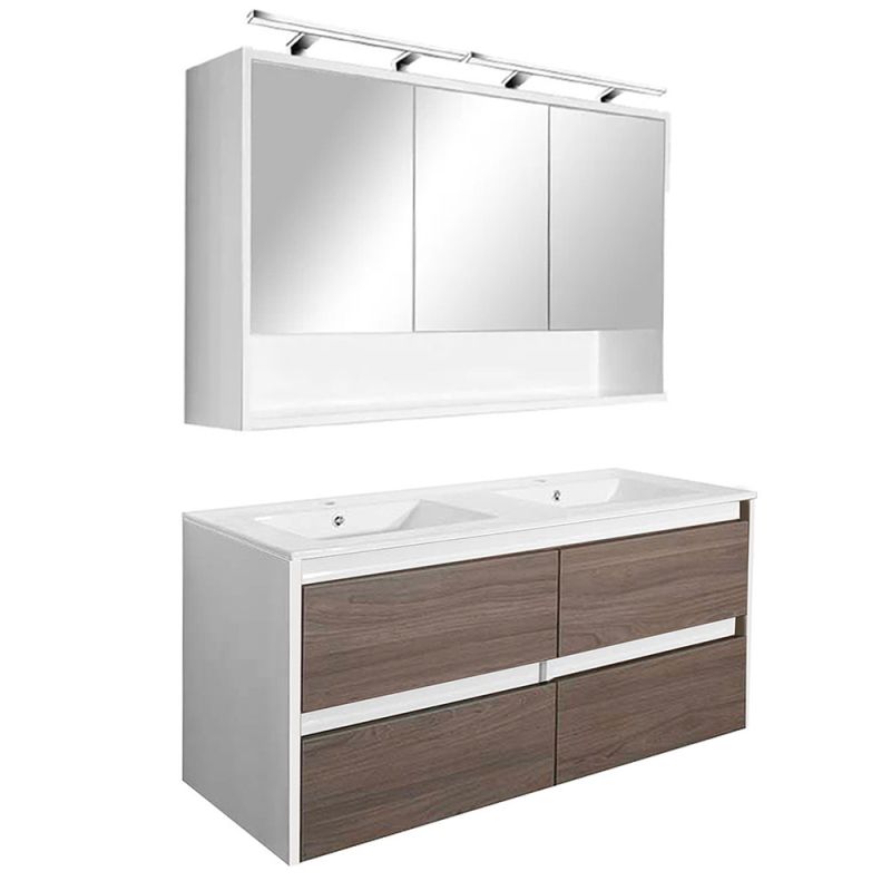 A csomag része a bútorra tökéletesen illeszkedő, fehér színű, dupla medencés kerámia mosdó is, amely két csaptelep számára kialakított hellyel rendelkezik. így nem kell külön keresni hozzá megfelelő mosdót. A csomag nem tartalmazza a lámpát, a csaptelepeket és a leeresztőt!