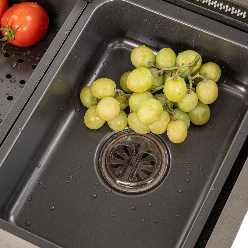 - Mosótál zárható lefolyóval, amely megkönnyíti az edények és zöldségek előkészítését.