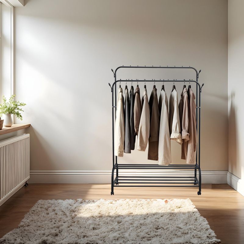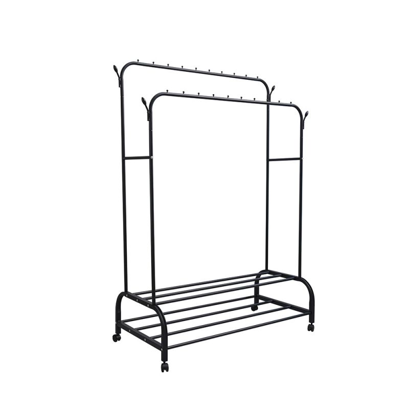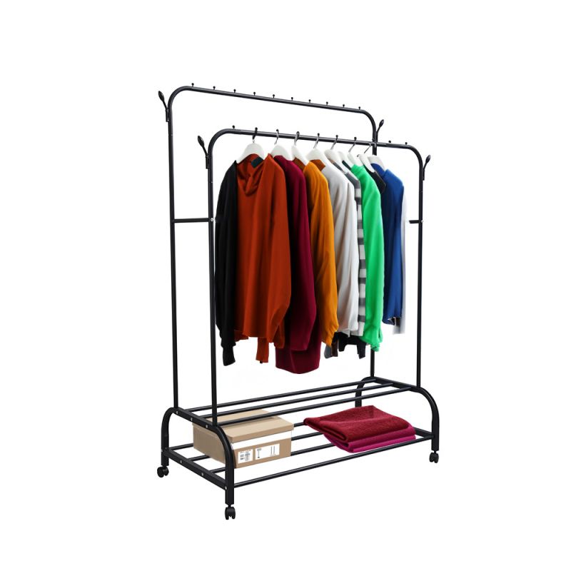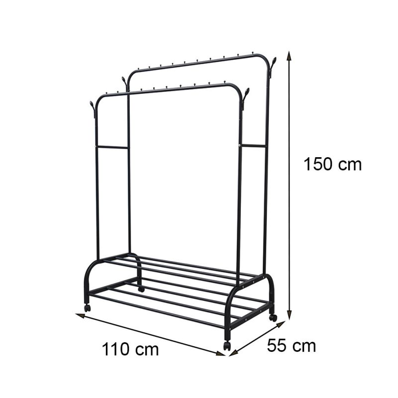 - Felépítés: Két vízszintes rúddal felszerelt, így dupla tárolóhelyet kínál a ruhák számára. Ideális kabátok, dzsekik, ruhák és egyéb ruhatári tárgyak felakasztásához.