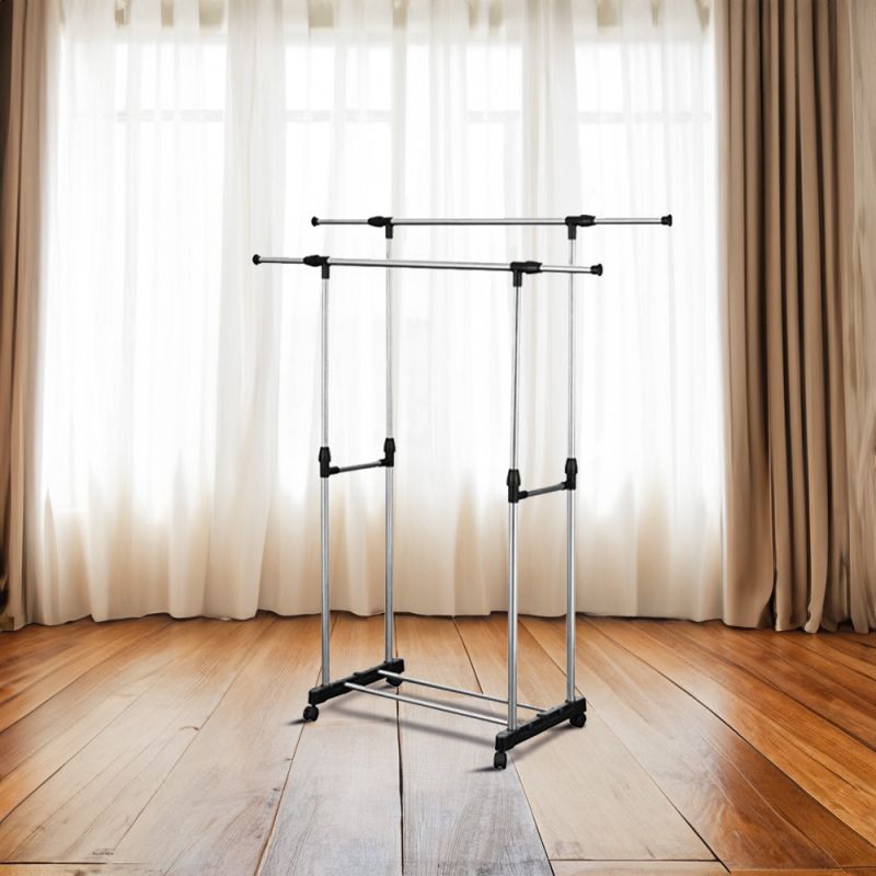 Használati Előnyök - Rugalmas használat: Az állítható magasságnak és a két szintnek köszönhetően a ruhaállvány különböző méretű ruhákhoz és kiegészítőkhöz is igazítható, legyen szó hosszú kabátokról, blúzokról vagy akár cipőkről.