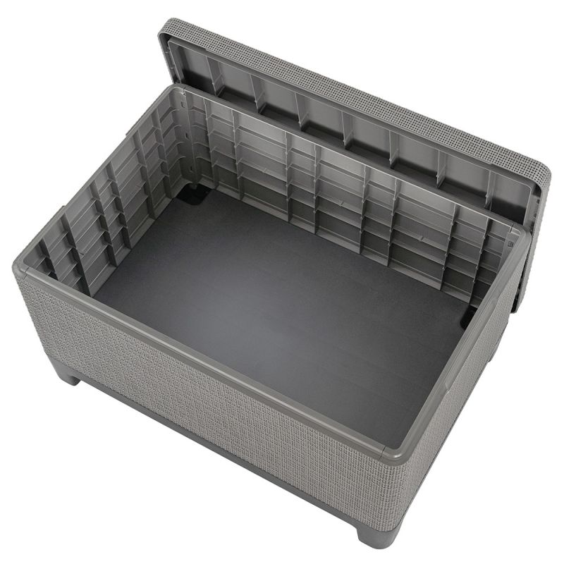 A modell egyik fő funkcionális eleme a zárt belső tárolótér, amely lehetőséget biztosít kisebb kiegészítők vagy használati tárgyak elhelyezésére. A tárolórekesz segíti a rendezett kültéri környezet kialakítását, miközben az asztallap továbbra is használható lerakófelületként. A tároló és az asztalfunkció kombinációja praktikus megoldást kínál olyan helyeken, ahol a helytakarékosság és az átgondolt kialakítás kiemelt szempont. Az asztal gyorsan és egyszerűen összeszerelhető, így rövid idő alatt használatba vehető.