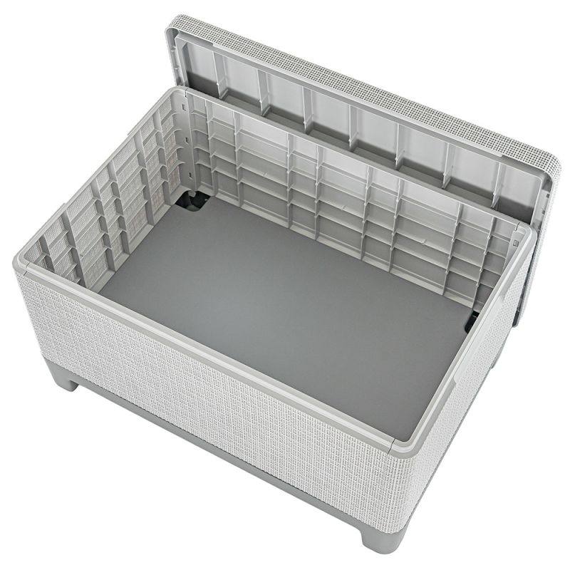 A modell egyik fő funkcionális eleme a zárt belső tárolótér, amely lehetőséget biztosít kisebb kiegészítők vagy használati tárgyak elhelyezésére. A tárolórekesz segíti a rendezett kültéri környezet kialakítását, miközben az asztallap továbbra is használható lerakófelületként. A tároló és az asztalfunkció kombinációja praktikus megoldást kínál olyan helyeken, ahol a helytakarékosság és az átgondolt kialakítás kiemelt szempont. Az asztal gyorsan és egyszerűen összeszerelhető, így rövid idő alatt használatba vehető.