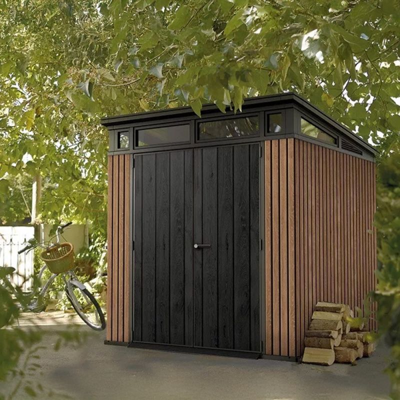 A Decocoat technológiával készült műanyag panelek természetes fa hatást keltenek, miközben teljesen gondozásmentesek. A megerősített acélszerkezet stabilitást biztosít, a lakattal zárható ajtó pedig extra védelmet nyújt. Méretei: 216x218x226 cm