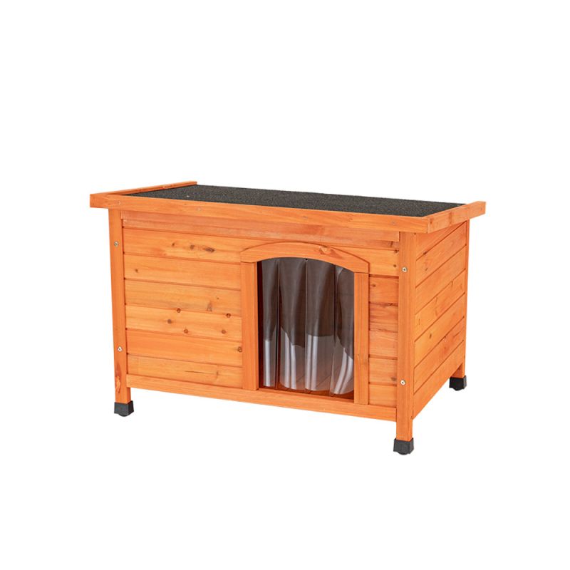 A lapostetős kivitel különösen előnyös szűkebb helyeken, ahol fontos a helytakarékos elhelyezés. A tetőt homokszórt bitumenes kátránypapír borítja, amely megbízható védelmet nyújt eső és nedvesség ellen. A lamellás műanyag ajtó csökkenti a huzatot, távol tartja a szelet és a csapadékot, miközben könnyű ki- és bejutást biztosít a kutyának.
