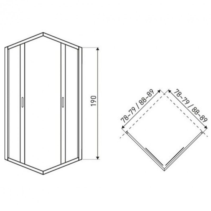 A zuhanykabin 6 mm-es edzett biztonsági üveggel van ellátva Easy Clean bevonattal. A zuhanykabin szögletes kivitelben kapható. Dupla tolóajtós kialakítással van ellátva. A kabint szabványos 80-as vagy 90-es zuhanytálcákkal lehet kiegészíteni. A zuhanytálca nem tartozék. A kabin belépő szélessége 39 cm. Méretek: magasság 190cm, szélesség 88-89x88-89cm, vagy 78-79x78-79cm.