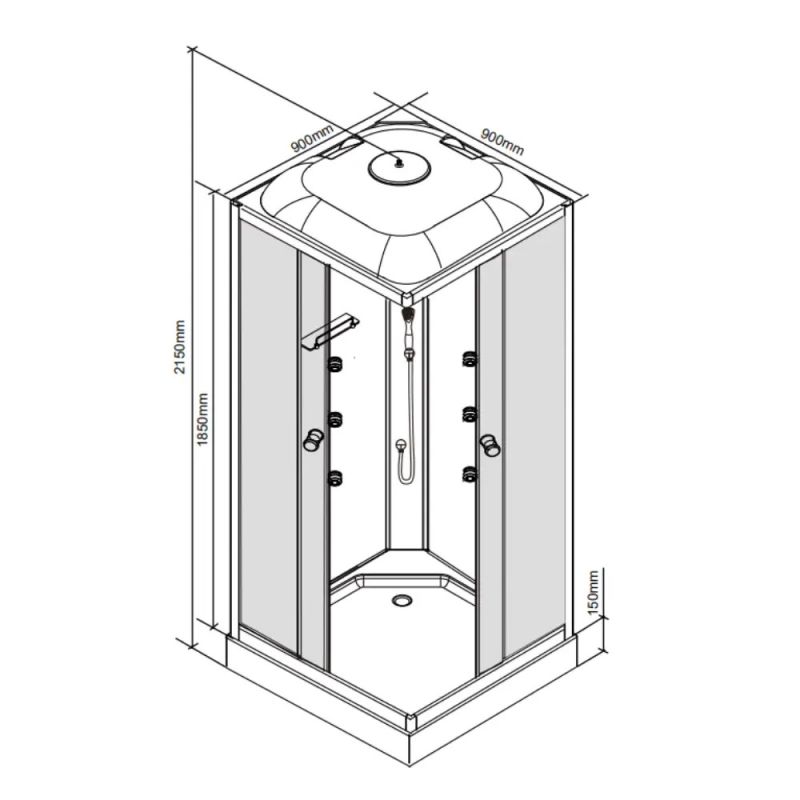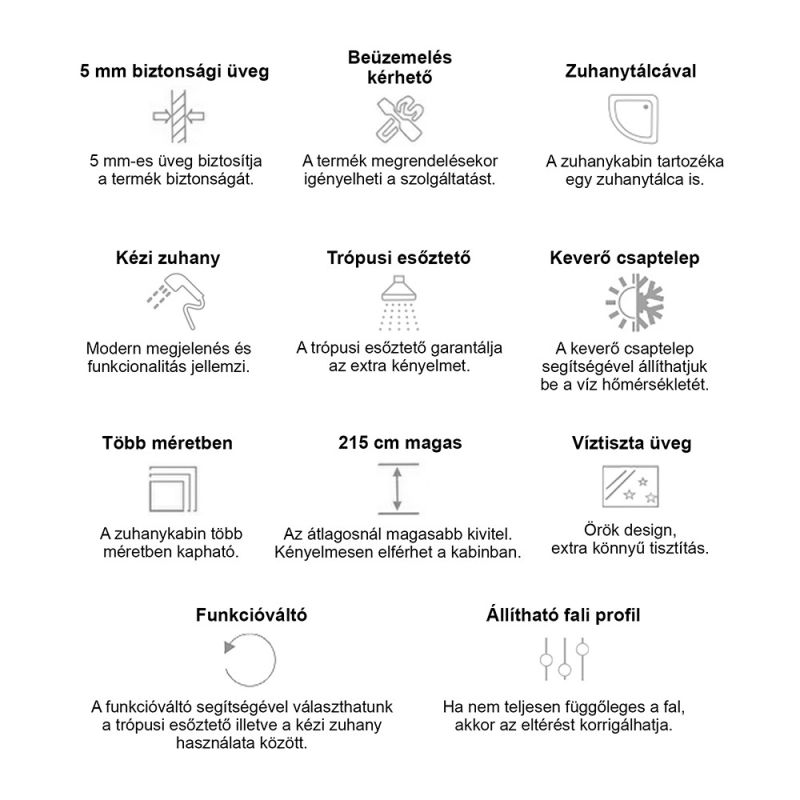 - Magasság: 185 cm (kabin), 215 cm zuhanytálcával együtt