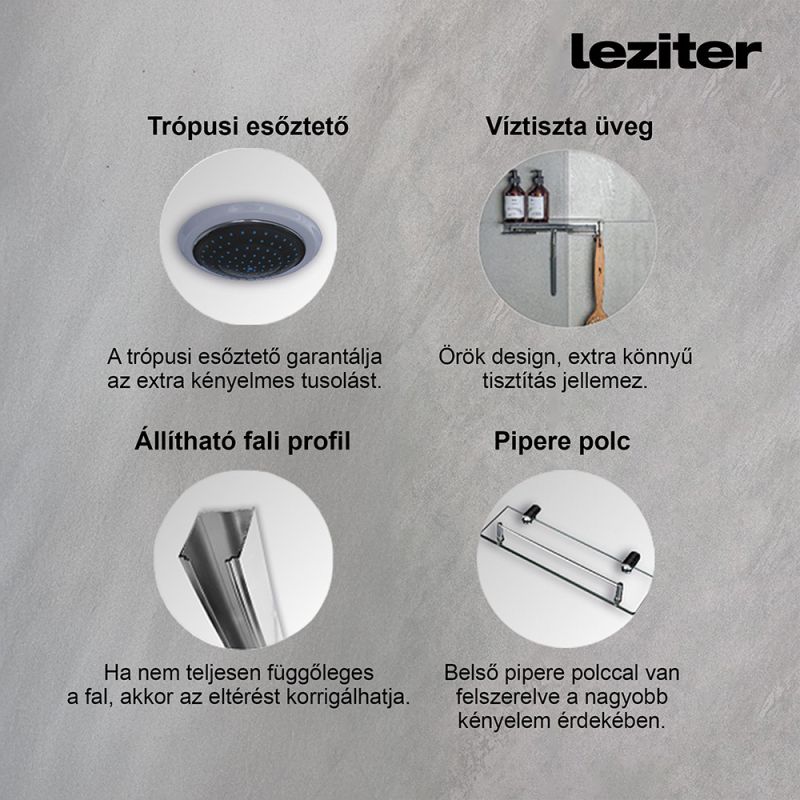 A Leziter Valerie szögletes hidromasszázs zuhanykabin kiemelkedik a hagyományos zuhanykabinok közül a beépített hidromasszázs fúvókák, a trópusi esőztető, és a kézi zuhanyfej által. A funkcióváltó kar segítségével könnyedén válthatók a különböző vízfunkciók.