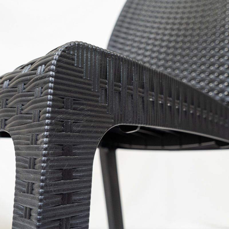 A szék a természetes rattan hatását utánozva műanyagból, polipropilénből készül. Ennek előnye, hogy bútor könnyen mozgatható, elegáns, mégis tartós és stabil, így biztonságosan használhatja. A gyártáshoz használt műanyag nagy részben újrahasznosított, így fenntarthatóbb választás lehet. A műrattan bútor további előnye, hogy vízálló, ellenáll a szélsőséges időjárási viszonyoknak és az UV sugárzásnak és könnyen tisztítható.