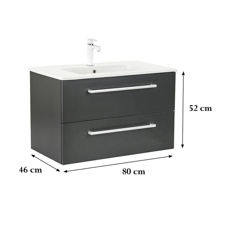 A Vario Clam 80 komplett fürdőszobabútor egy stílusos és praktikus választás modern fürdőszobához. Kompakt méretei ideálisak kisebb és közepes méretű fürdőszobákba is, és a fém fogantyú profil patinás hatást, az antracit-antracit színű dizájn elegáns megjelenést kölcsönöz a térnek. A csillapítós fiókzáródás és a felfüggesztett kivitel a kényelmet és könnyű tisztántartást szolgálja, míg a minőségi anyagok hosszú élettartamot biztosítanak.