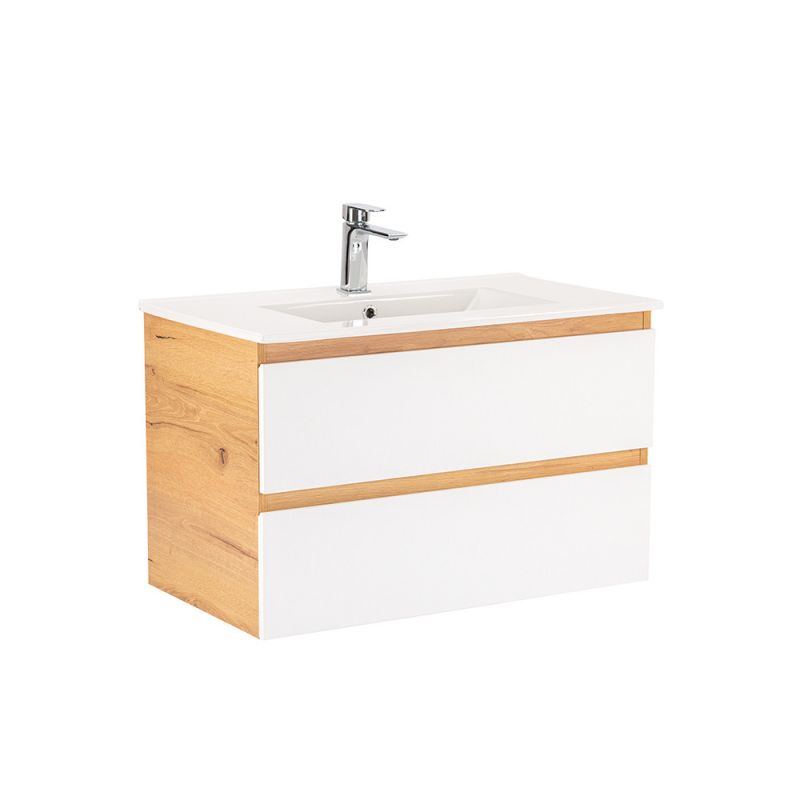A Vario Forte 80 komplett fürdőszobabútor egy stílusos és praktikus választás modern fürdőszobához. Kompakt méretei ideálisak kisebb és közepes méretű fürdőszobákba is, a 45 fokos élzáródás modern hatást, a tölgy-fehér színű dizájn elegáns megjelenést kölcsönöz a térnek. A csillapítós fiókzáródás és a felfüggesztett kivitel a kényelmet és könnyű tisztántartást szolgálja, míg a minőségi anyagok hosszú élettartamot biztosítanak.