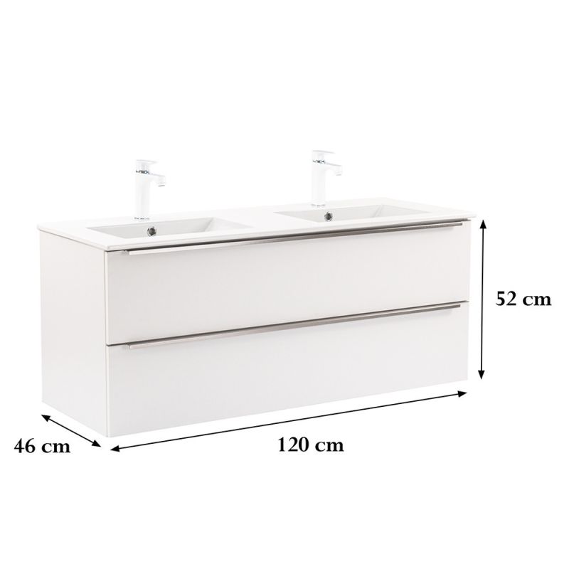 - Elegáns és praktikus mosdó: A bútor flat design kerámia mosdóval érkezik, amely kétmedencés kivitelű. Modern, esztétikus és könnyen tisztítható.