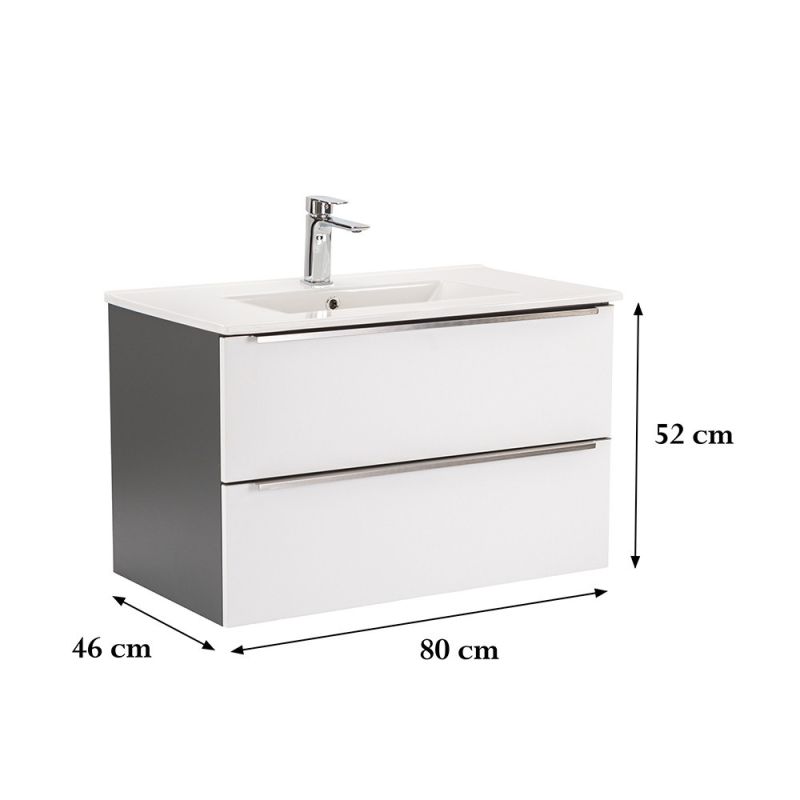 A Vario Trim 80 komplett fürdőszobabútor egy stílusos és praktikus választás modern fürdőszobához. Kompakt méretei ideálisak kisebb és közepes méretű fürdőszobákba is, és a fém fogantyú profil patinás hatást, az antracit-fehér színű dizájn elegáns megjelenést kölcsönöz a térnek. A csillapítós fiókzáródás és a felfüggesztett kivitel a kényelmet és könnyű tisztántartást szolgálja, míg a minőségi anyagok hosszú élettartamot biztosítanak.