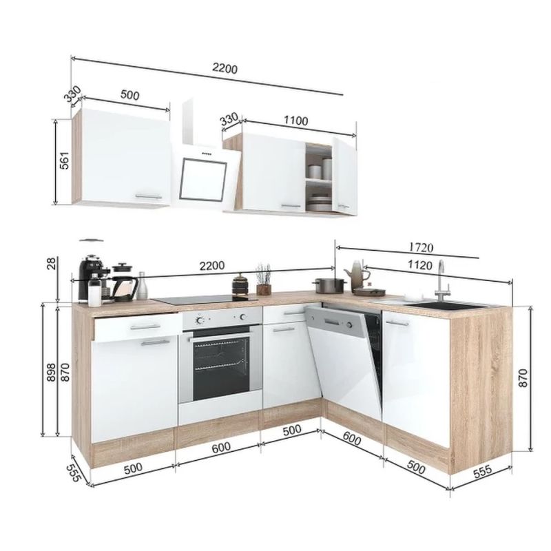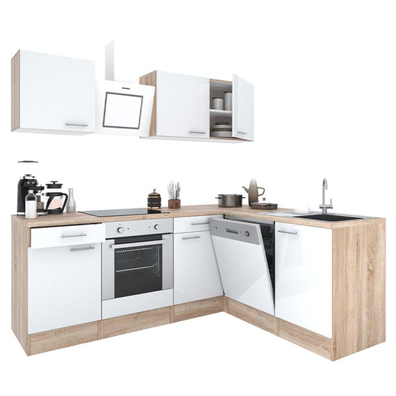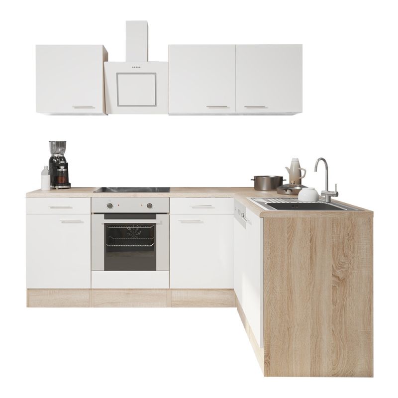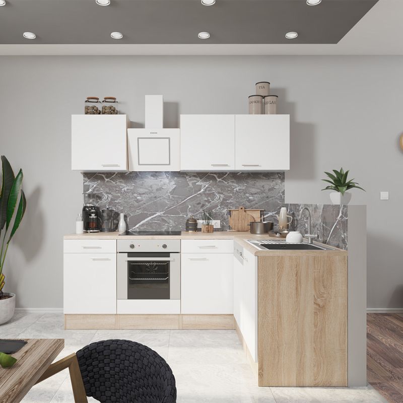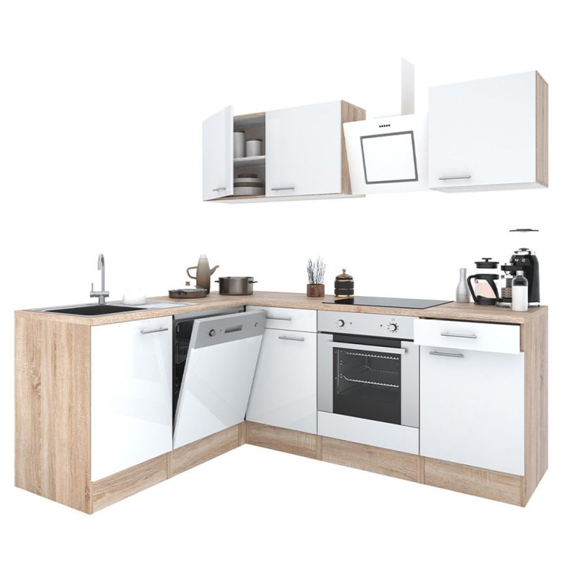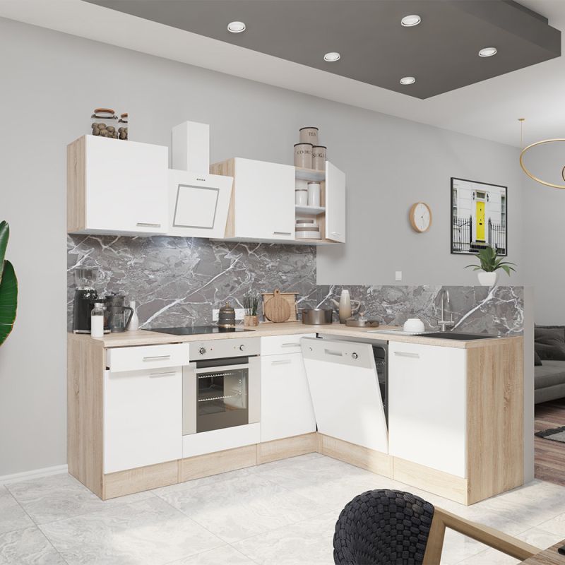 Yorki 220 sarok konyhablokk sonoma tölgy korpusz, selyemfényű fehér fronttal. A tökéletes konyha megteremtője!