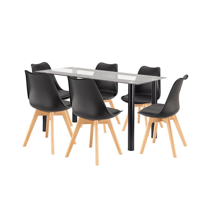 Zelma 6+1 étkezőgarnitúra fekete-fekete – modern üveg asztal és kényelmes székek tökéletes harmóniája